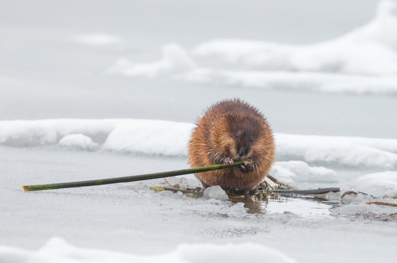 I sat watching this little Muskrat dive below ice to bring food to the surface, in sub zero temperatures, for over an hour. At one point, the muskrat dived in, narrowly escaping a swooping Peregrine Falcon that regularly scours the area. The tough little muskrat came back up to carry on eating as if nothing had happened