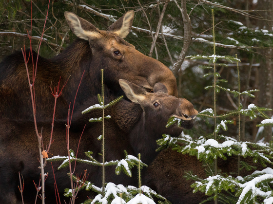 I watched this Moose with her two young ones, moving along a trail within Algonquin Provincial Park this Winter. I took this photograph as one of her young offspring stopped to snack on the twigs and branches of the trees