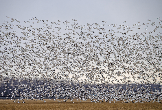 Snow Geese suddenly exploding into the air from a cornfield, eastern Ontario.