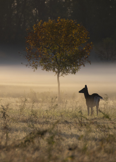 A deer moves slowy across a misty meadow towards a tree in full fall colours. Taken near Whitby, Ontario.