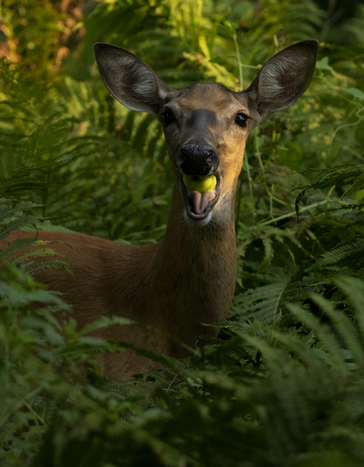 Whitetail deer love apples, and this doe seemed to particularly enjoy noisily crunching through each one it found as it browsed around the edge of an old orchard. Taken near Whitby, Ontario.