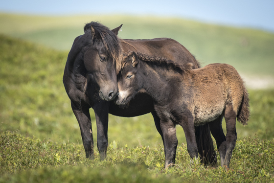 A mare and her foal in a sweet moment, living wild and free on Nova Scotia's remote Sable Island