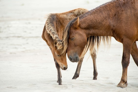 A wild Sable Island stallion gives a tender nudge to his young foal. There are over 500 wild horses living on Sable Island off the coast of Nova Scotia.
