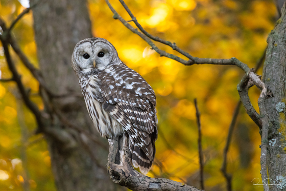 I was out for a walk in the Gatineau Park when I spotted this Owl sitting on this tree. The setting was beautiful with the fall colours in the background.