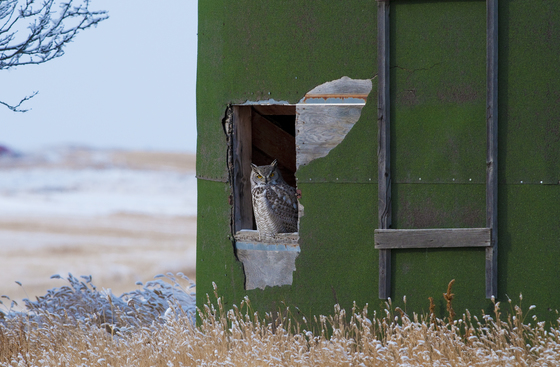 A subarcticus Great Horned Owl on the Saskatchewan prairies, taking shelter from the cold winter wind in a grain silo.