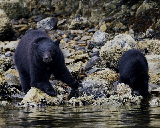 Black bear mom on shore watching back as her cub eats