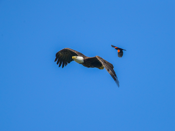 Bald eagles are often harassed by various birds, this time driven by a red-wings black bird