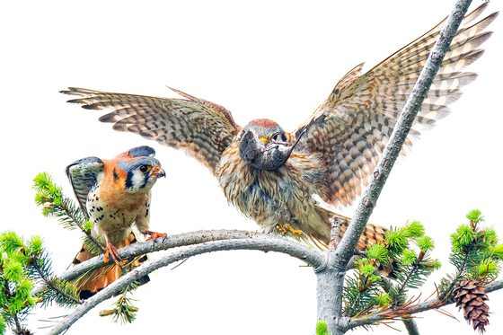American Kestrel The male passed the caught mouse to the female, and she spread her wings.