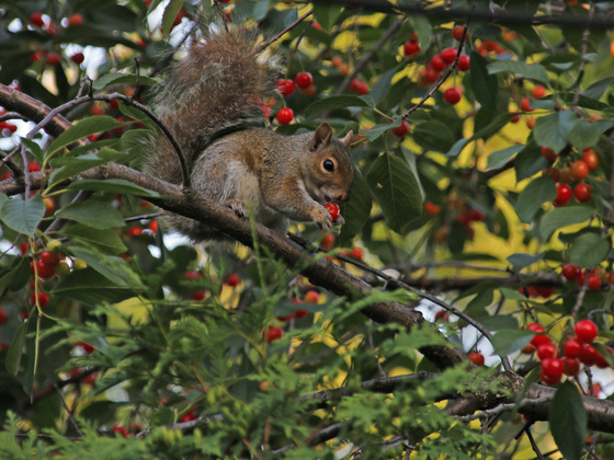 My backyard neighbor has a cherry tree and the squirrels are having a great time. I picked the golden hour to try to catch one in action. As squirrels are skittish most evenings I had no luck at all. In this shot I was hidden from view to the squirrel by the tall spruce hedge as one can see the tips of the hedge.