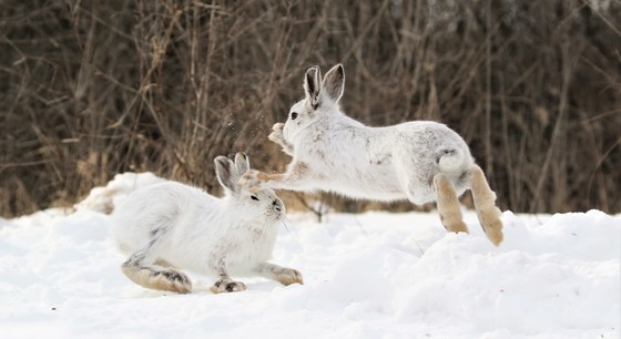 Always a good laugh to watch Snowshoe Hares jumping at each other. After observing them for several years, to me, it looks like they are playing more than fighting. They are so quick, I am even surprised at times that I get a shot of both in the same frame.
