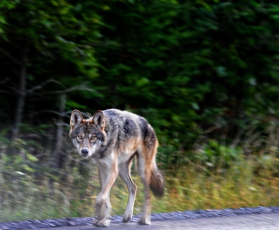 This Algonquin Wolf was on the move down the shoulder of road looking to get around a lake blocking its direct route