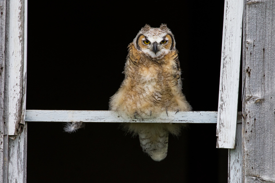 A Great Horned Owl had chosen to build her nest in a large tree, in the garden of an abandoned house, in Val Marie, Saskatchewan. Eventually the fledglings began to use the doorways and window frames of the house to perch and wait while the mother would go off to hunt.