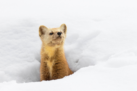 A Pine Martens emerges from a system of tunnels under the snow, sniffing the air to establish if it's safe to come out.