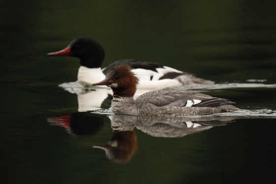 A pair of Common Mergansers swim past on a dark but still day in Tod Inlet near Victoria.
