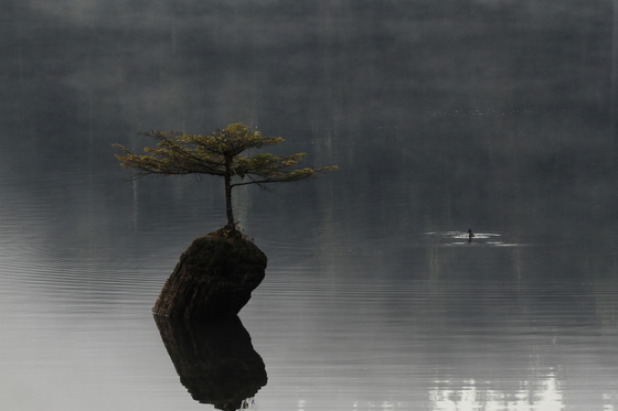 A lone duck floats by a lonely tree on a foggy morning at Fairy Lake on Vancouver Island.