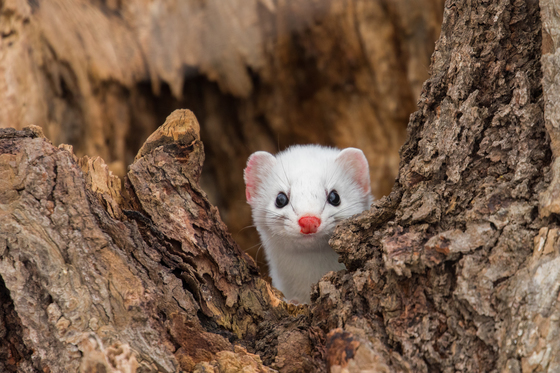 last January I watched this Ermine hunt and kill a grey squirrel twice its size in a neighbours garden. He then proceeded to carry his prey from the garden, across a road and into a hollowed out tree. An incredible feat of strength and determination ! I took this photograph as the ermine popped out of the tree, his nose stained red from his fresh kill.