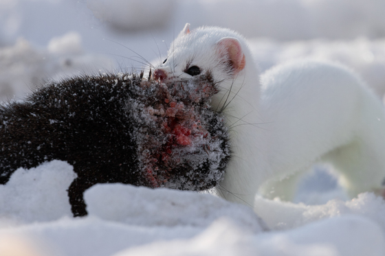 This Ermine had been stalking the Grey Squirrels in a neighbours garden, eventually catching and killing one. The Ermine then proceeded to carry the much larger squirrel all the way from the garden, across a road and into a hollow tree in an opposite field. It took him a long time but the ferocity, strength and determination of the Ermine was an incredible thing to observe.