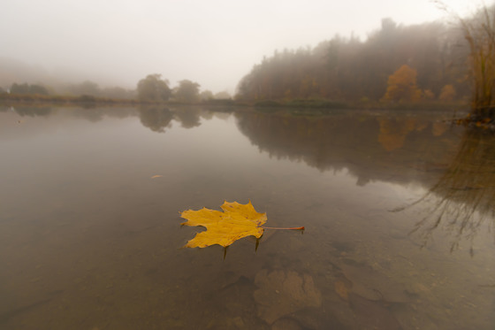 It was a foggy autumn morning at Earl Bales Lake, Toronto. I took this photo of a single leaf in the waters, by noon the entire lake was covered with beautiful colored leaves.