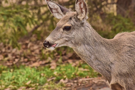 A town deer out on a stroll in a park takes a moment to savour a snack of fallen catkins from the park trail.
