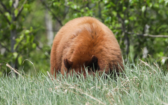 A cinnamon bear eats fresh grasses near Liard Hot Springs