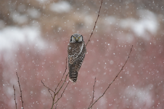 I took this photograph on a dark, wet February day. I had travelled quite a ways for a chance to see this uncommon visitor for the first time, and was not sure I had picked the right day. The snow was thick, I was cold and beginning to lose hope, when this little owl appeared and began hunting for voles among a vast field of pink blueberry plants. It was a magical moment and the 10th owl in my quest to photograph the owls of British Columbia.