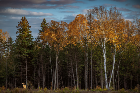 Deer standing in the light of a recently clear cut suburban lot. Taken from the drive through at a coffee shop.