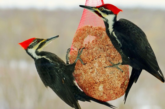 Pileated Woodpeckers on Suet Ball In Northern Ontario
