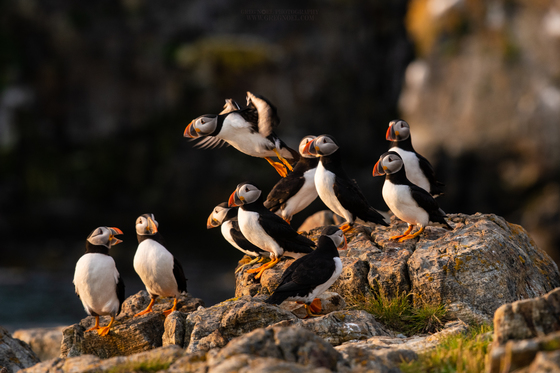 A puffin takes flight towards the sun one evening in Elliston.