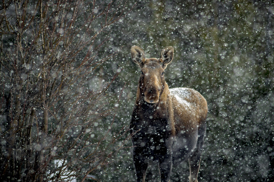 Noticed this cow moose munching on some alders just as a snow squall moved in, the amount of flurries made it difficult to focus, but I managed to walk away with a few that were in focus.