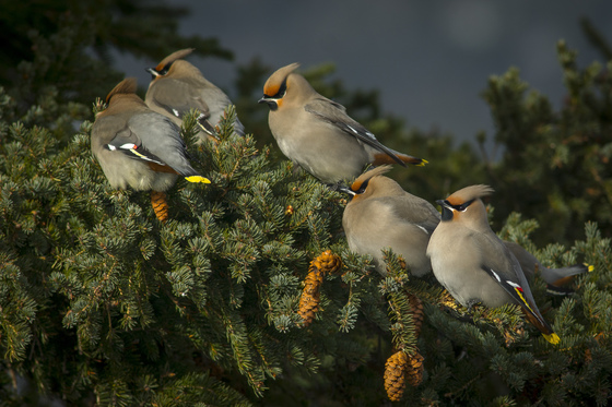 Watched a flock of bohemian waxwings feeding on some berries and some apples in a meadow. In between feeding routines, they would perch on a nearby spruce tree.