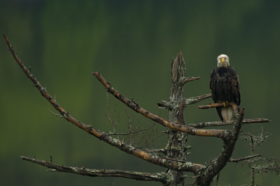 A mature bald eagle is perched on a dead tree in the rain. The tree was located down a hill towards the shorline which gave a great vantage point with the calm water and green reflection in the water behind the eagle and tree.