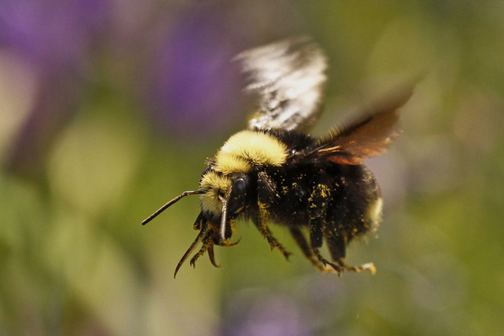 A Bumblebee hovers over a flower in Victoria.