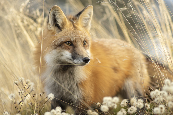 This fox was mousing about some tall grass and shrubs in late November, the sun was low over the horizon which created some great light for the gold grass and shrubs this fox was hunting in.