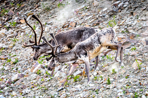 This photo was taken in the Yukon along the Top of the World highway west of Dawson City. Each year the Fortymile herd passes through the area, and I was lucky enough to witness it. These two happened to be running as they were spooked by passing vehicles.