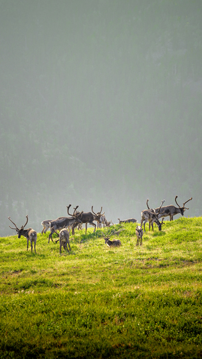 This photograph was taken near the Top of the World Highway this summer as the Forty Mile Herd made its annual trek through the area. After reading Lost in the Barrens as a child, seeing a travelling herd was on my life's bucket list so I felt very fortunate. It's one of the few herds whose population is relatively stable (others have declined by 90%), making the sighting even sweeter. The green haze in the background is due to forest fire smoke, which made the whole experience more dream-like.