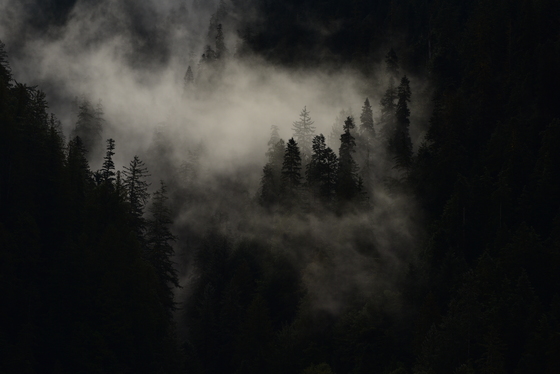 Mystic morning light as we travelled along mussel inlet in Fjordlands Provincial Park, BC. In this small valley hung the mist in these ancient tree tops that caught my eye. There are no edits & it was not processed to be a B&W.