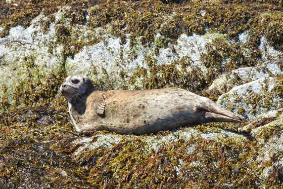 Mother seal has some relaxing time while she watches over a few pups in the water below her.