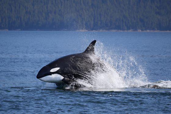 A Orca in the Great Bear Rainforest is launching out of the water to attack a large male Steller Sea Lion.