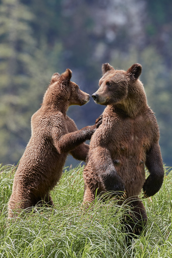 A Grizzly Bear cub grabbing his mothers back as they stand to get a better look over a little hill