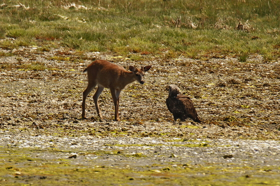 A deer and Bald Eagle stare each other down on a beach in Ucluelet, BC.