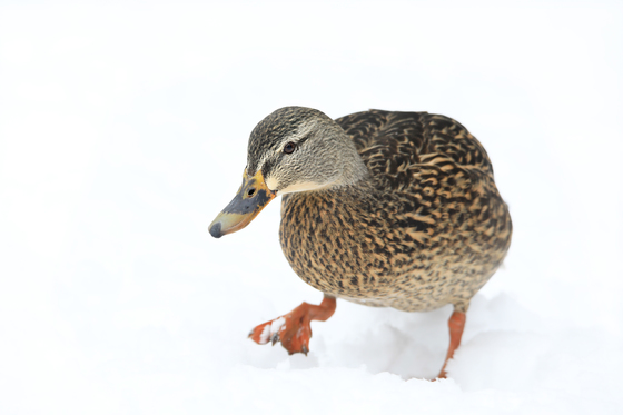 A female Mallard is walking on fesh snow.