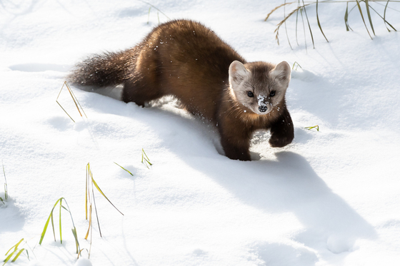 My romance with the pine marten continues! I've had an ongoing "relationship" with this cutie who lives in the forest behind my parents' house in Canmore, AB. I just love watching him bound through the snow, especially when that little nose of his gets covered with flakes! Cute as a button (Nov 2019)