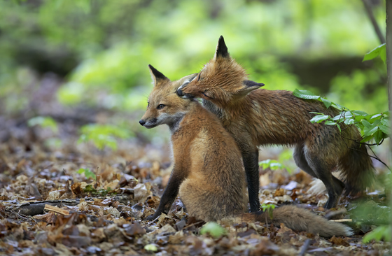 Mama fox cleans her kits ears