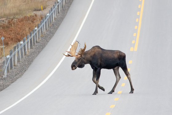 This is probably the biggest Bull Moose I have seen and photographed! Taken late in the day, luckily with very little traffic! This guy crossed, went though the marsh and tried to go into the woods. His antlers were impeding him, so he change his mind! So amazing!!