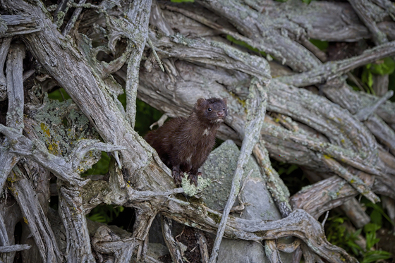While kayaking I noticed this curious mink peering through the root of an old tree that had toppled over in a storm many years ago.