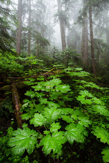 Blackcomb Mountain, despite carrying the reputation of being a world-class ski destination, is also home to some otherworldly old-growth forest. Here, devils club lines the foggy forest floor along the popular ascent trail.