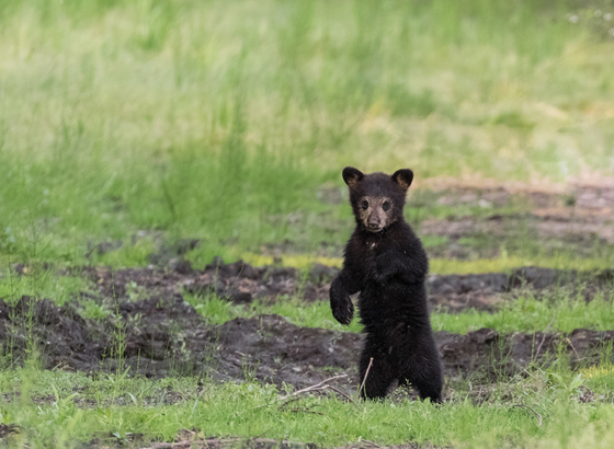 Earlier this spring I was watching a mother black bear bear forage on grass wile her twin cubs played nearby. Here is one of the cubs who curiously stood up to get a better look.