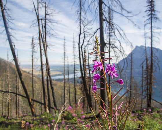Fire weed growing in a section of burnt forest on the way to Bertha Falls