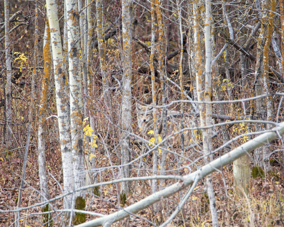 Coyote hiding in the forest in Elk Island National Park