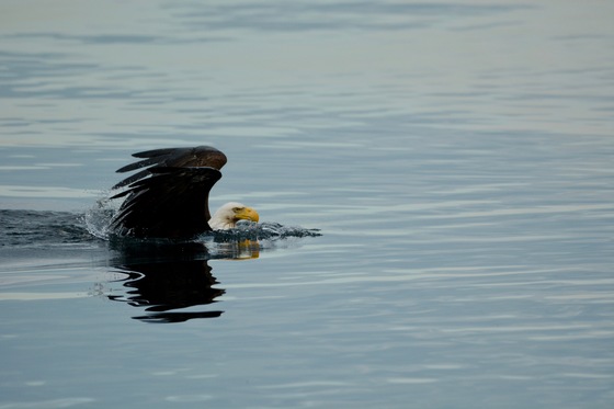 An incredible sight to witness! This bald eagle had caught a fish that was too heavy to lift out of the water. It began using its powerful wings to paddle to shore in order to enjoy its meal.